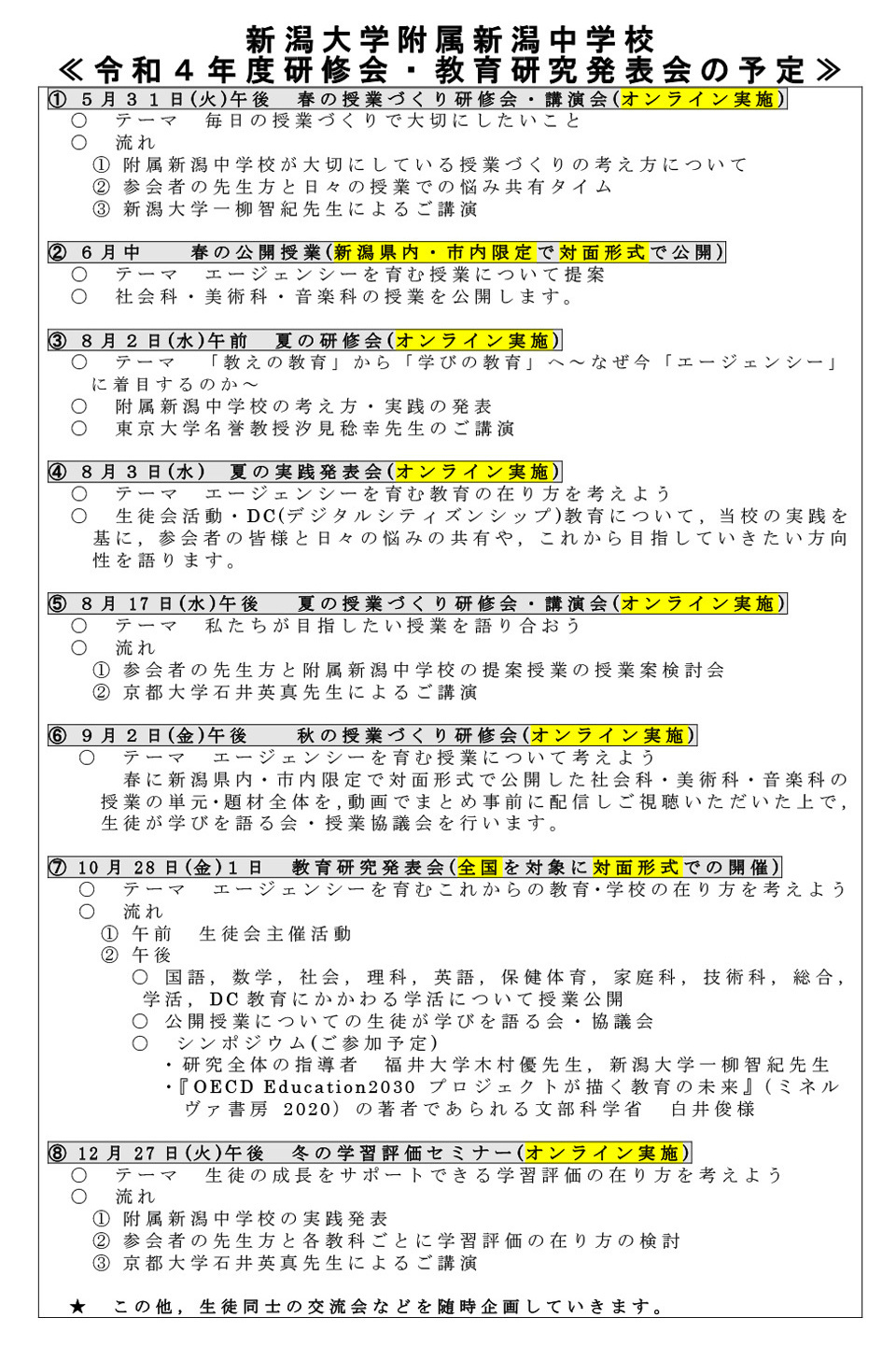 HOME | 令和4年度の研究 「令和4 年度教育研究発表会お申込みフォーム(10 月24 日(月)締め切り 人数制限あり(先着順) https://forms.gle/TpS2t28uhsKcqGef8 」 新潟大学附属新潟中学校の各種研修会の案内を「個人的に送って欲しい!」,そんな先生方は下記のURLよりお申込みください。年間を通じて,各種研修会の案内をお申込みいただいたアドレスに直接お送りさせていただきます。 R4新潟大学附属新潟中学校 各種研修会案内申込み登録フォーム https://forms.gle/H53iDQxUcw3KXsgk6 ページトップへ